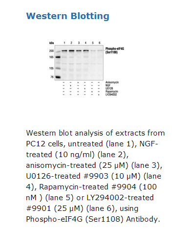 Phospho-eIF4G (Ser1108) Antibody detects eIF4GI only when phosphorylated at Ser1108. It does not cross-react with nonphosphorylated eIF4GI or p97.