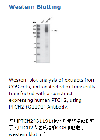 PTCH2 (G1191) Antibody detects transfected levels of PTCH2 protein. It does not recognize transfected levels of human PTCH1 protein.