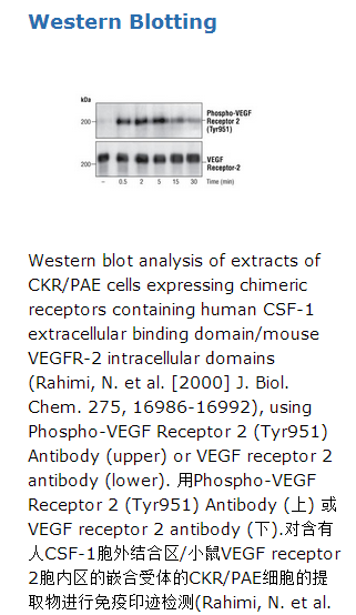 Phospho-VEGF Receptor 2 (Tyr951) Antibody detects endogenous VEGFR-2 only when phosphorylated at Tyr951.