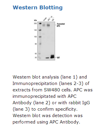 APC抗体检测内源性的总APC蛋白。多克隆抗体是通过一种合成的肽段去免疫动物产生。这种合成的肽段与包围于人源APC蛋白序列一致,抗体由蛋白A和肽段亲和层析技术纯化。腺瘤结肠息肉(APC)肿瘤抑制基因在大部分家族性和散发性大肠癌中突变,编码一个大的胞质蛋白,与细胞迁移,粘附和增殖有关(1)。APC直接结合微管,APC的缺失会因为染色体错误分离导致有丝分裂纺锤体缺陷和非整倍体产生(2)。APC被认为有支架蛋白特征,结合β-catenin,涉及胞内浓度调控。Wnt信号不存在时,GSK-3β磷酸化APC-β-catenin-axin的复合物的三成员,β-catenin的磷酸化创出一个泛素识别位点,这是一个蛋白酶调节降解的信号。Wnt存在时,dishevelled使GSK-3β失活,β-catenin协调对细胞周期进程和增殖中重要蛋白基因的转录,如cyclin D1和 c-Myc(3)。
