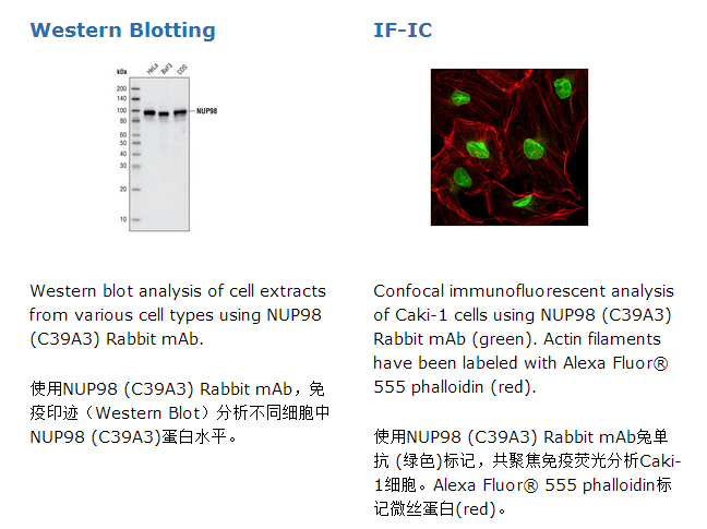 NUP98 (C39A3) Rabbit mAb兔单抗检测内源性NUP98总蛋白。通过人工合成人源NUP98蛋白Pro671位点周围相应的多肽片段去免疫动物从而制备出单克隆抗体。NUP98 (nucleoporin 98 kDa)是核孔复合物的一个成员。首先以三种不同的前体表达,随后这个前体经历自动剪切产生一个共同的氨基端98 kDa大小的多肽(NUP98)和羧基端6, 96 (NUP96)和88 (p88) kDa大小的多肽(1-2)。NUP98蛋白在它的氨基端含有FG和GLFG重复结构域和它的羧基端含有一个RNA结合域(3)。NUP98基因定位在chromosome 11p15.5,该区域在白血病中频繁地重新排列。迄今,对于NUP98蛋白已经确认15个融合伴侣 (4-5)。