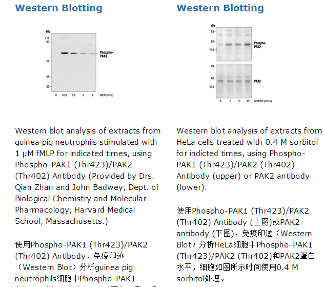 Polyclonal antibodies are produced by immunizing animals with a synthetic phosphopeptide corresponding to residues surrounding Thr423 of human PAK1. Antibodies are purified by protein A and peptide affinity chromatography.