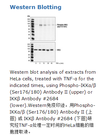 Phospho-IKKα/β (Ser176/180) Antibody II 分别能检测内源的在Ser176和Ser180位点磷酸化的IKKα蛋白和在Ser177和Ser181位点磷酸化的IKKβ。多克隆抗体是通过合成对应的IKKβ Ser177/181 位点周围的肽段来免疫动物而获得。抗体是通过protein A和多肽亲和层析法纯化。NF-κB/Rel转录调控因子在细胞质中与IκB抑制蛋白结合以非活性形式存在(1-3)。大部分激活因素采用通常信号通路即磷酸化诱导并通过蛋白水解酶体介导降解IκB的方法激活NF-κB (3-7)。此通路中最重要的步骤是激活高分子量的IκB激酶(IKK)复合体,此复合体催化的反应中有三个紧密相关的IKK亚基参与完成,IKKα and IKKβ 作为激酶的催化单元,IKKγ作为调控单元(8,9)。IKK的激活依赖于特定位点的磷酸化:IKKβ活性环中的 Ser177和Ser181位点以及IKKα中的serine 176 和 180 位点,这些位点的磷酸化引起蛋白构象的变化从而激活激酶(10-13)。