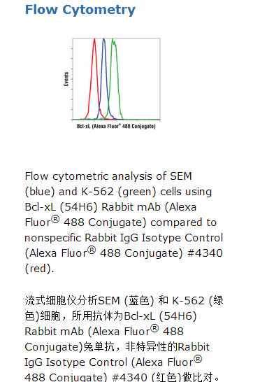 This Cell Signaling Technology antibody is conjugated to Alexa Fluor®488 fluorescent dye and tested in-house for direct flow cytometric analysis of human cells. The unconjugated antibody #2764 reacts with human, mouse, rat and monkey Bcl-xL protein. CST expects that Bcl-xL (54H6) Rabbit mAb (Alexa Fluor®488 Conjugate) will also recognize Bcl-xL in these species.