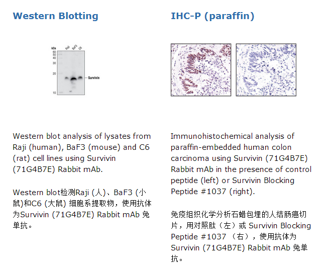 Survivin (71G4B7E) Rabbit mAb 兔单抗能够检测内源性水平survivin总蛋白。该单克隆抗体是采用合成的人源survivin蛋白Cys60周围残基相对应的肽段免疫动物而制备的。Survivin是一个在胎儿发育和肿瘤细胞恶变过程中高表达的抗凋亡蛋白,大小为16 kDa(1)。Survivin结合并抑制caspase-3,通过抑制细胞凋亡调控和促进细胞分裂,从而来控制细胞周期的G2/M-期临界点(2,3)。这个调控过程需要Survivin在P34 CDC2激酶的作用下,在Thr34位发生磷酸化(4)。通过基因打靶实验和Survivin反义RNA实验,应用Thr34磷酸化缺陷的survivin突变体,已经证明了survivin能够抑制肿瘤的生长(5,6)。