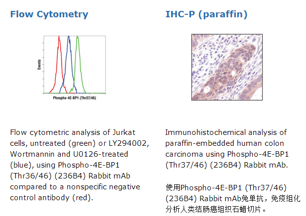 Phospho-4E-BP1 (Thr37/46) (236B4) Rabbit mAb兔单抗可检测仅在Thr37或Thr46位点磷酸化的内源性4E-BP1蛋白水平。该抗体可以与在等效位点磷酸化的4E-BP2和4E-BP3蛋白发生交叉反应。通过人工合成小鼠4E-BP1 蛋白Thr37和Thr46位点周围序列相应的多肽片段去免疫动物从而制备单克隆抗体。翻译抑制蛋白4E-BP1 (又称 PHAS-1)通过结合翻译起始因子eIF4E蛋白从而抑制帽子结构依赖的翻译。4E-BP1的过磷酸化干扰上述结合并且导致激活帽子结构依赖的翻译(1)。PI3 kinase/Akt通路和FRAP/mTOR激酶通路都调节4E-BP1蛋白的激活(2,3)。在体内4E-BP1多个位点残基被磷酸化(4)。通过FRAP/mTOR蛋白使4E-BP1在Thr37和Thr46位点磷酸化不能阻止它eIF4E结合,但这被认为是为随后在4E-BP1的Ser65和Thr70位点磷酸化进行准备(5)。