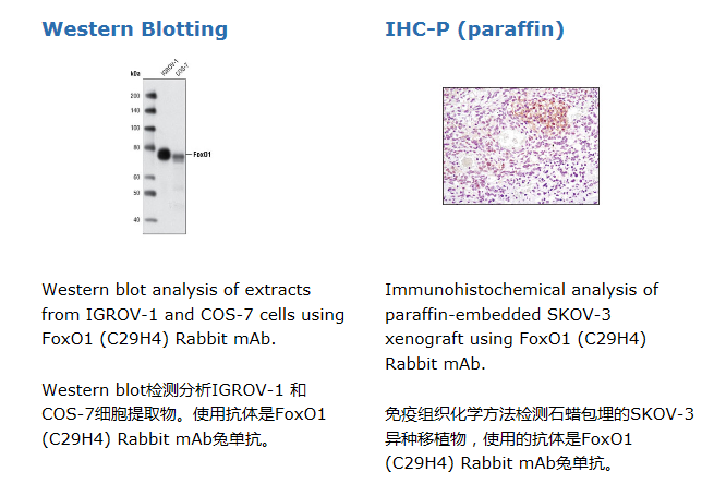 FoxO1 (C29H4) Rabbit mAb兔单抗能够检测内源性的FoxO1总蛋白。抗体不和其他外源性表达的家族蛋白FoxO3a 和 FoxO4反应。该单克隆抗体是采用与人源FoxO1 蛋白羧基端序列相对应的GST融合蛋白免疫动物而生产的。Forkhead转录因子家族参与横纹肌肉瘤和急性白血病的发生(1-3)。在这个家族中,三个成员(FoxO1,FoxO4和FoxO3a)与线虫的同源基因DAF-16具有序列相似度,而DAF-16介导包括IGFR1,PI3K和Akt在内的信号通路(4-6)。活化的forkhead成员作为肿瘤抑制因子,促进细胞周期阻滞和凋亡。FOXO家族任何成员的表达上调都会激活细胞周期抑制剂p27 Kip1。Forkhead转录因子也参与TGF-β介导的p21 CIP1上调,而这个上调过程可以被PI3K负调控(7)。forkhead转录因子被Akt在Thr24,Ser256以及Ser319磷酸化后而失活,导致出核转运与转录因子活性的抑制(8),最终导致增殖上调。Forkhead转录因子活性也可以被去乙酰化酶sirtuin(SirT1)抑制(9)。