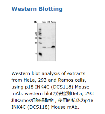 The p18 INK4C (DCS118) Mouse mAb detects endogenous levels of p18 INK4C protein. The antibody does not cross-react with other proteins of the INK4 family.