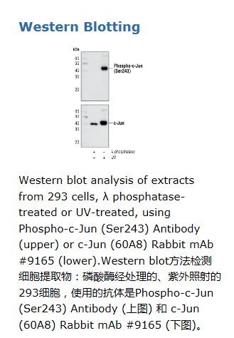 Phospho-c-Jun (Ser243) Antibody detects endogenous levels of total c-Jun protein only when phosphorylated at Ser243.