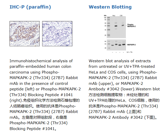 Phospho-MAPKAPK-2 (Thr334) (27B7) Rabbit mAb detects endogenous levels of MAPKAPK-2 protein only when phosphorylated at threonine 334.