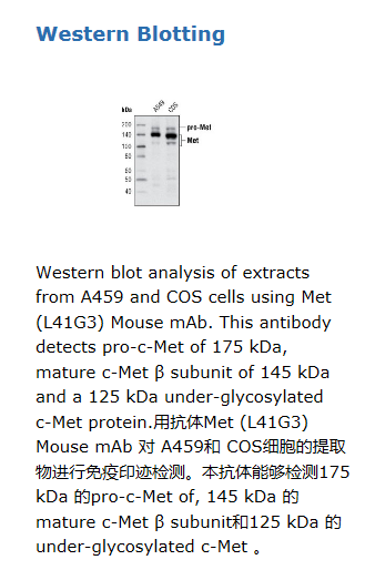 Met (L41G3) 鼠单抗检测内源总Met蛋白,与其它相关蛋白不发生交叉反应。单克隆抗体通过用多肽免疫动物得到,该多肽是根据人的Met蛋白羧基端序列合成的。Met作为肝细胞生长因子 (HGF, 亦作扩散因子) 的高亲和性酪氨酸激酶受体是一个二硫键连接的异二聚体,含有一个45 kDa的 α-亚基和一个145 kDa的 β-亚基 (1,2)。α-亚基和β-亚基的氨基端形成胞外区,β-亚基的其余部分跨细胞膜并且含有一个具有激酶活性的胞内区。Met和HGF相互作用会导致多个酪氨酸位点的自磷酸化,继而招募下游信号分子Gab1, c-Cbl和 PI3 K激酶(3)。这一系列基础性事件对于Met激酶相关的所有生物学功能十分重要。胞内Tyr1003位点的磷酸化对于Met的泛素化和降解是必须的(4)。激酶结构域Tyr1234/1235的磷酸化对于Met的激酶活性十分关键。胞内 Tyr1349的磷酸化为Met提供了Gab1 的直接结合位点(5)。在肾、结肠和乳腺癌中发现有Met水平和/或激酶活性的改变,因此Met是肿瘤治疗和诊断的一个靶点(6,7)。