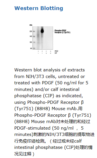 Phospho-PDGF Receptor β (Tyr751) (88H8) Mouse mAb detects endogenous levels of PDGF receptor β only when phosphorylated at tyrosine 751.The antibody may cross-react with PDGF receptor α when highly overexpressed.