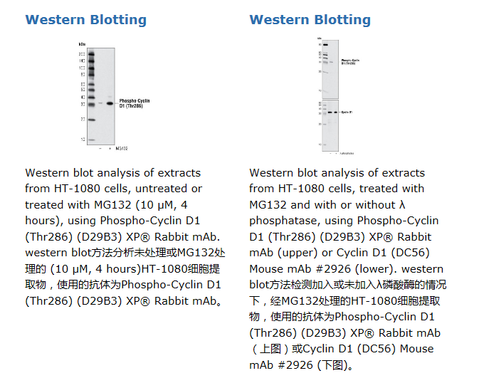 Phospho-Cyclin D1 (Thr286) (D29B3) XP® Rabbit mAb detects endogenous levels of cyclin D1 only when phosphorylated at Thr286. The antibody does not cross-react with other cyclin D family members.