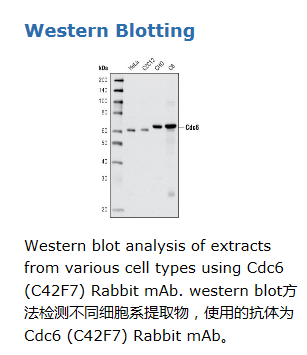 Cdc6 (C42F7) Rabbit mAb detects endogenous levels of total cdc6 protein.