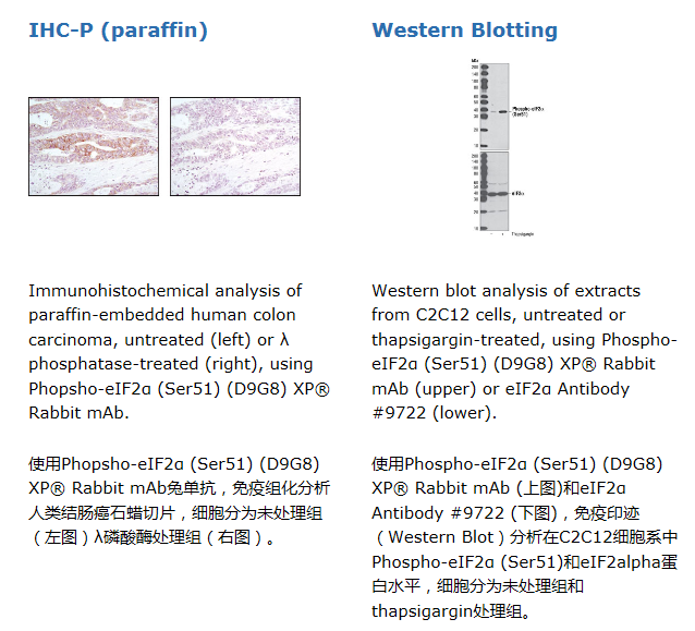 Phospho-eIF2α (Ser51) (D9G8) XP® Rabbit mAb detects endogenous eIF2α only when phosphorylated at Ser51. The antibody does not recognize elF2α phosphorylated at other sites.