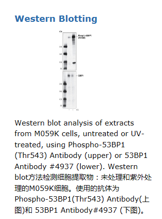 Polyclonal antibodies are produced by immunizing animals with a synthetic phosphopeptide corresponding to residues surounding Thr543 of human 53BP1. Antibodies are purified using protein A and peptide affinity chromatography.