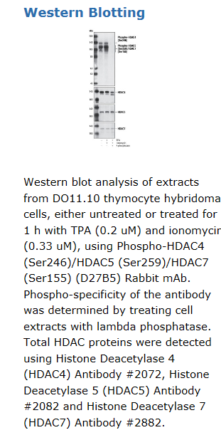 Phospho-HDAC4 (Ser246)/HDAC5 (Ser259)/HDAC7 (Ser155) (D27B5) Rabbit mAb detects endogenous levels of HDAC4, HDAC5 and HDAC7 proteins only when phosphorylated on Ser246, Ser259 and Ser155, respectively.