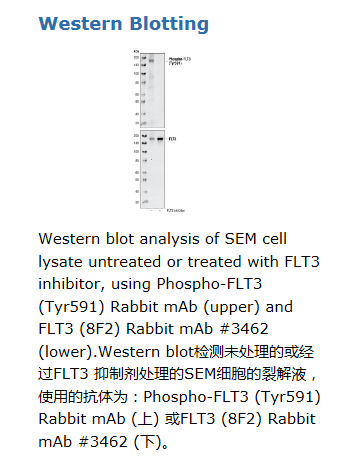 Phospho-FLT3 (Tyr591) (33G6) Rabbit mAb detects endogenous levels of FLT3 only when phosphorylated at tyrosine 591. The antibody may cross-react with some tyrosine-phosphorylated proteins. (US Patent No. 7,183,385 and foreign equivalents assigned to Cell Signaling Technology, Inc.)