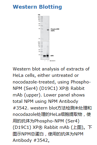 Phospho-NPM (Ser4) (D19C1) XP® Rabbit mAb detects endogenous levels of NPM only when phosphorylated at Ser4.