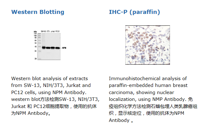 Polyclonal antibodies are produced by immunizing animals with a synthetic peptide corresponding to residues surrounding the amino-terminus of human NPM. Antibodies are purified by protein A and peptide affinity chromatography.