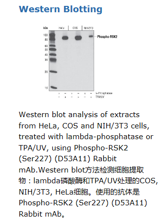 Phospho-RSK2 (Ser227) (D53A11) Rabbit mAb detects endogenous levels of RSK2 only when phosphorylated at Ser227. It shows cross-reactivity with RSK1 when phosphorylated at the homologous serine residues.