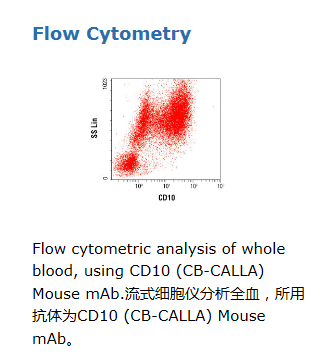 CD10 (CALLA or neprilysin) was identified as a marker for leukemic cells in children with acute lymphoblastic leukemia and belongs to a family of exoenzymes that include aminopeptidase A, N and dipeptidylpeptidase IV (1-2). CD10 is a transmembrane type II molecule and functions as a metallo-peptidase requiring zinc. Specifically, CD10 cleaves 1-3 amino-terminal amino acids from peptides with a preference for neutral amino acids (valine, iso-leucine, phenylalanine, leucine or alanine) (2). The CD10 antigen is expressed by immature and by germinal center B cells, by granulocytes and by acute B-cell lymphoblastic leukemia cells. Therefore, CD10 appears to be involved in late stage regulation of hematopoietic cells (3).
