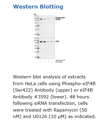 Phospho-eIF4B (Ser422) Antibody检测仅在Ser422位点磷酸化的内源性eIF4B蛋白。通过人工合成人源eIF4B蛋白Ser422位点周围序列相应的磷酸化片段去免疫动物从而制备多克隆抗体。通过蛋白A和多肽亲和层析纯化抗体。真核生物起始因子4B (eIF4B)被认为在蛋白质翻译起始阶段协助eIF4F复合物。在植物中,已知eIF4B蛋白和poly-(A)结合蛋白相互作用,从而增加它与poly-(A)结合活性(1)。虽然eIF4B在胰岛素刺激下发生磷酸化和蛋白质翻译增加保持很大的相关性,但是热休克和血清饥饿能够引起eIF4B在多个位点去磷酸化,这类似一些翻译抑制的动力学特征(2-5)。许多激酶包括p70 S6 激酶能够在体外使eIF4B磷酸化,同时至少一个血清诱导的eIF4B磷酸化位点对rapamycin和LY294002敏感(6)。最近研究证明Ser406位点是通过有丝分裂素调节的新型磷酸化位点(7),同时这个磷酸化位点是依赖于MEK和mTOR通路的活化(7)。因此,这个位点的磷酸化对eIF4B翻译活性起着至关重要的作用(7)。研究证明p70 S6激酶能够在体内使eIF4B蛋白在rapamycin敏感位点Ser422发生磷酸化,而eIF4B蛋白的Ser422Ala突变体在体外翻译实验中显示活性消失(7)。