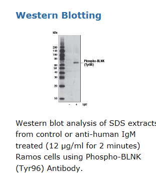 Phospho-BLNK (Tyr96) Antibody detects endogenous levels of BLNK only when phosphorylated at tyrosine 96.