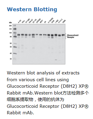 Glucocorticoid Receptor (D8H2) XP® Rabbit mAb recognizes endogenous levels of total glucocorticoid receptor protein. Based upon sequence alignment, this antibody is predicted to cross-react with all known alternative translation start site generated isoforms of glucocorticoid receptor-α and glucocorticoid receptor-β. This antibody does not cross-react with mineralocorticoid receptor.