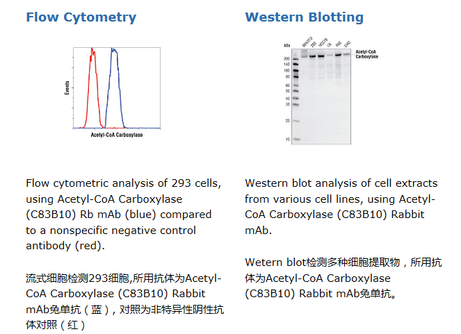 Acetyl-CoA Carboxylase (C83B10) Rabbit mAb detects endogenous levels of all isoforms of acetyl-CoA carboxylase protein.