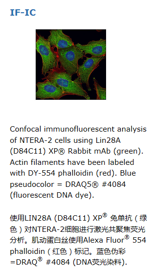 LIN28A (D84C11) XP® 兔源单抗检测内源性总LIN28A 蛋白水平。此单克隆抗体由合成肽段免疫动物产生,该合成肽段与人类LIN28A蛋白C末端氨基酸残基序列一致。LIN28A 和LIN28B是一类在发育过程中保守的调控RNA结合蛋白,它抑制let-7家族的miRNAs的处理加工和成熟过程[1,2]。let-7 miRNAs已经显示抑制ras、myc和Hmga2等癌基因[3]。近来研究显示LIN28A 和LIN28B在人类主要肿瘤和肿瘤细胞系中上调表达。它们的过表达直接与下调的let-7 miRNAs正相关[4]。LIN28基因被报道与原生殖细胞发育和精原细胞恶性肿瘤相关[5]。LIN28B的等位基因变异与人类青春期周期调控有关[6]。过表达的LIN28A联合Oct-4, Sox2, 和Nanog可重调人成纤维细胞重编程成多潜能ES样细胞[7]。