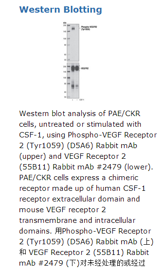 磷酸化VEGF Receptor 2 (Tyr1059) (D5A6) 兔单抗仅在Tyr1059磷酸化时才能检测内源VEGFR2 蛋白的水平。因为VEGF receptors 1, 2 和3 在表位区具有相通的序列,所以本抗体同样能检测相应酪氨酸位点磷酸化的VEGF receptors 1 和 3 。单克隆抗体用合成的磷酸化多肽免疫动物得到,该多肽根据人VEGF receptor 2 的Tyr1059附近的氨基酸合成。血管内皮生长因子受体2 (VEGFR2, KDR, Flk-1)是内皮细胞上VEGF诱导信号时的一个主要受体。和配体结合之后,VEGFR2发生自磷酸化并被活化(1)。VEGFR2 主要的自磷酸化受体位于激酶插入区 (Tyr951/996)和酪氨酸激酶催化区(Tyr1054/1059) (2)。受体的激活会导致对包括Shc, Grb2, PI3K激酶, Nck 和蛋白酪氨酸磷酸化酶SHP-1 和 SHP-2接头蛋白的快速招募(3)。Tyr1212的磷酸化为Grb2提供了结合位点而且磷酸化的Tyr1175能结合PI3K激酶的p85 亚基以及PLCγ和 Shb (1,4,5)。VEGFR2信号传导对于实现VEGF刺激引起的增殖、趋化和发芽,以及体外培养的内皮细胞的增殖和体内血管的发生是必需的(6-8)。