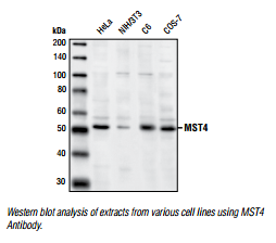 Mst4 Antibody detects endogenous levels of total Mst4 protein independent of phosphorylation. The antibody does not cross-react with Mst1-3.