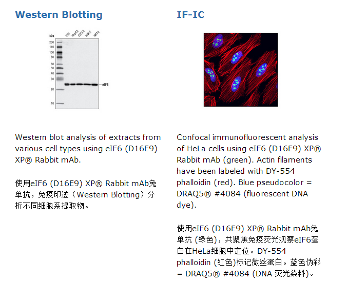 eIF6 (D16E9) XP® Rabbit mAb检测内源性eIF6总蛋白水平。通过人工合成人源eIF6蛋白相应序列的多肽片段去免疫动物从而制备出单克隆抗体。核仁里60S核糖体亚基的装配需要真核生物起始因子6 (eIF6)(1)。在细胞质中eIF6可以结合到60S核糖体亚基从而阻止它们结合40S核糖体亚基以形成80S核糖体(2)。研究也显示eIF6蛋白与RNA诱导的沉默复合物 (RISC)相互联系(3)。eIF6基因沉默能终止miRNA介导的沉默(3)。eIF6可能通过阻止翻译起始或核糖体循环在miRNA介导的沉默中起到重要的作用(3)。
