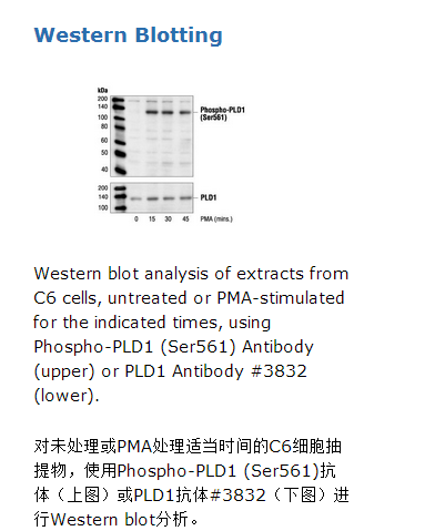Polyclonal antibodies are produced by immunizing animals with a synthetic phosphopeptide corresponding to residues surrounding Ser561 of human PLD1. Antibodies are purified by protein A and peptide affinity chromatography.