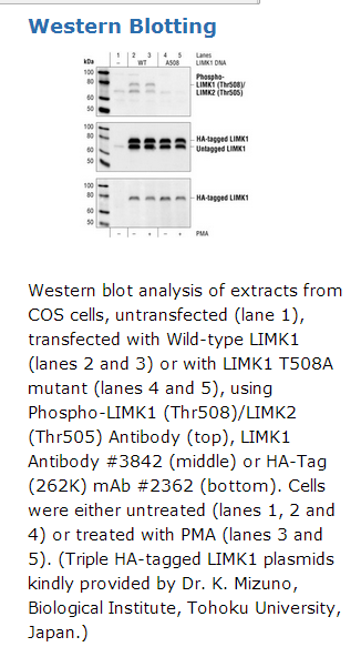 Polyclonal antibodies are produced by immunizing animals with a synthetic phosphopeptide corresponding to residues surrounding Thr508 of human LIMK1. Antibodies are purified by protein A and peptide affinity chromatography.