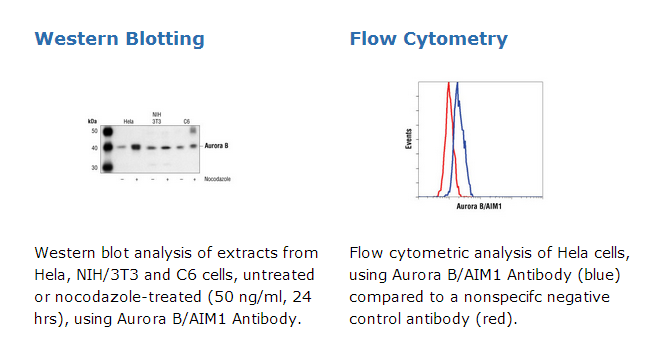 Polyclonal antibodies are produced by immunizing animals with a synthetic phosphopeptide corresponding to the amino terminus of human Aurora B/AIM1. Antibodies are purified by protein A and peptide affinity chromatography. Monoclonal antibody is produced by immunizing animals with a synthetic peptide corresponding to the amino terminus of human Aurora A/AIK, residues around Thr288 of human Aurora A, or residues surrounding Thr232 of human Aurora B.