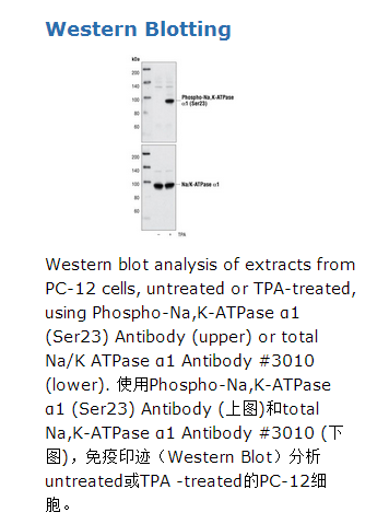 Phospho-Na,K-ATPase α1 (Ser23) Antibody recognizes endogenous levels of Na,K-ATPase α1 only when phosphorylated at Ser23. The residue number, Ser23, is based on the sequence of the immature form of the protein, corresponding to Ser18 of the mature cleaved form.