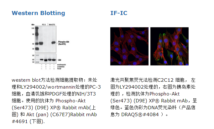 Phospho-Akt (Ser473) (D9E) XP® Rabbit mAb 能够检测内源性的丝氨酸(473位点)磷酸化的AKT蛋白。