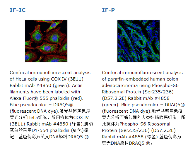 Please follow CST’s recommended IF and Flow protocols. For both applications, following secondary detection: Flow Cytometry: Centrifuge cells and resuspend in 0.5 ml DRAQ5® diluted 1:5000 (1 µM) in Incubation Buffer. Incubate for 5 min at room temperature in the dark before analyzing cells on flow cytometer. Immunofluorescence: Rinse samples twice in PBS for five minutes each. Dilute DRAQ5® 1:1000 (5 µM) in PBS and incubate for 5 minutes at room temperature in the dark. Rinse samples once in PBS, coat coverslips with anti-fade reagent and examine immediately using appropriate excitation wavelength.
