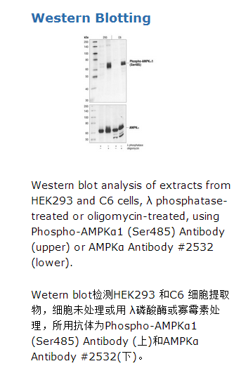 Phospho-AMPKα1 (Ser485) Antibody detects endogenous levels of AMPKα1 only when phosphorylated at serine 485. The antibody does not cross-react with phosphorylated AMPKα2 or other related proteins.