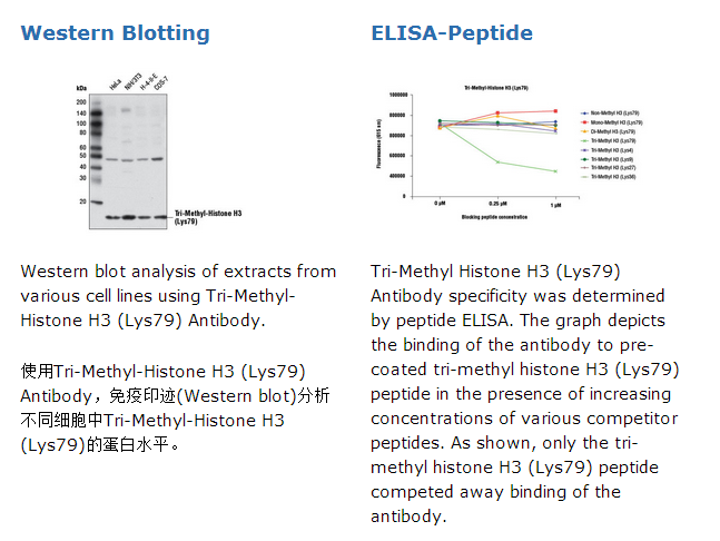 Tri-Methyl-Histone H3 (Lys79) Antibody recognizes endogenous levels of histone H3 protein only when tri-methylated at Lys79. This antibody may also show slight cross-reactivity toward histone H3 when di-methylated at Lys79. This antibody does not cross-react with methylated histone H3 (Lys4, 9, 27, or 36).