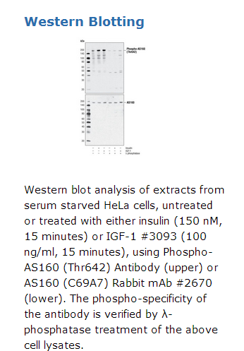 The polypeptide insulin is a major hormone controlling critical energy functions such as glucose and lipid metabolism. Insulin binds to and activates the insulin receptor (IR) tyrosine kinase, which phosphorylates and recruits different adaptor proteins. The signaling pathway initiated by insulin and its receptor stimulates glucose uptake in muscle cells and adipocytes through translocation of GLUT4 glucose transporter from the cytoplasm to the plasma membrane (1). A 160 kDa substrate of the Akt Ser/Thr kinase (AS160, TBC1D4) is a Rab GTPase-activating protein that regulates insulin-stimulated GLUT4 trafficking. AS160 is expressed in many tissues including brain, kidney, liver, and brown and white fat (2). Multiple Akt phosphorylation sites have been identified on AS160 in vivo, with five sites (Ser318, Ser570, Ser588, Thr642, and Thr751) showing increased phosphorylation following insulin treatment (2,3). Studies using recombinant AS160 demonstrate that insulin-stimulated phosphorylation of AS160 is a crucial step in GLUT4 translocation (3) and is reduced in some patients with type 2 diabetes (4). The interaction of 14-3-3 regulatory proteins with AS160 phosphorylated at Thr642 is a necessary step for GLUT4 translocation (5). Phosphorylation of AS160 by AMPK is involved in the regulation of contraction-stimulated GLUT4 translocation (6).