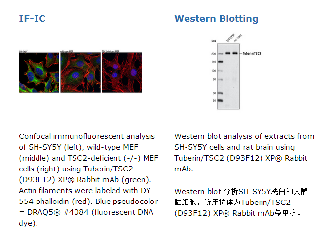 Tuberin/TSC2 (D93F12) XP™ Rabbit mAb兔单抗检测内源性的tuberin蛋白的总量。该单克隆抗体是采用与tuberin蛋白羧基末端残基相对应的合成肽段免疫动物生产的。马铃薯球蛋白(Tuberin)是TSC2肿瘤抑制基因的产物,是细胞增殖和肿瘤发展的重要调节因子(1)。TSC2或与之相关的TSC1(hamartin)的突变可以引起结节硬化复合体TSC(tuberous sclerosis complex),是一种常染色体显性遗传病,其特点为发生多种广泛的非恶性肿瘤(2)。Tuberin可以在Thr1462位点直接被Akt/PKB 磷酸化(3)。 在Thr1462 和 Tyr1571位点的磷酸化可以调节tuberin-hamartin复合体和tuberin的活性(3-5)。另外,tuberin可以抑制mTOR(mammalian target of rapamycin), 进而推动p70 S6激酶的抑制和真核细胞抑制因子4E结合蛋白(4E-BP1,一种转录起始抑制因子)的活性,并最终抑制翻译(3,6,7)。