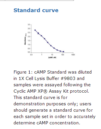 此试剂盒的免疫活性经由以下物质测试:ADP, AMP, ATP, cAMP, cGMP, cIMP, cTMP, CTP, GDP, GMP以及GTP。相对小的交叉反应在cGMP和cIMP中观察到,而cAMP的敏感性比此两者高10倍。在测试的各物质中没有观察到其它交叉反应。试剂盒对cAMP的敏感性,如图1所示,范围为0.2-12nM。 特异性处理后的细胞cAMP水平的变化如图2(CHO细胞)和图3(293细胞)所示。