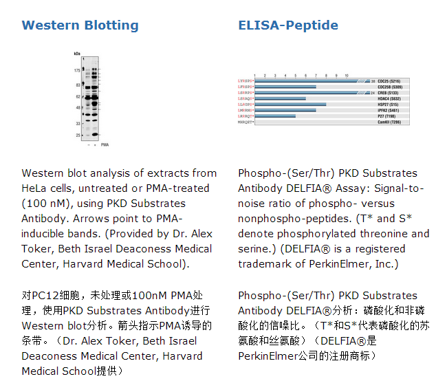 Phospho-(Ser/Thr) PKD Substrates Antibody detects peptides and proteins containing a phospho-Ser/Thr residue with arginine at the -3 position and leucine at the -5 position, prefering proline at the -1 position within the motif. The antibody may cross-react with some peptides and proteins containing an arginine residue at -3 position and a hydrophobic or basic residue at the -5 position. (U.S. Patent No's.: 6,441,140; 6,982,318; 7,259,022; 7,344,714; U.S.S.N. 11,484,485; and all foreign equivalents.)