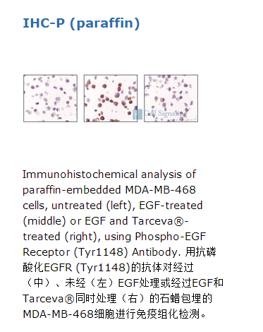 Phospho-EGF Receptor (Tyr1148) Antibody detects endogenous levels of EGF receptor only when phosphorylated at tyrosine 1148. This antibody does not cross-react with other tyrosine-phosphorylated ErbB family members.