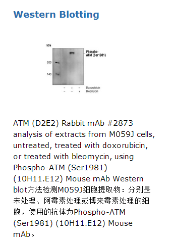 Phospho-ATM (Ser1981) (10H11.E12)能够检测内源性的丝氨酸(1981位点)磷酸化的ATM蛋白。该单克隆抗体是由合成的人源的针对ATM蛋白丝氨酸(1981位)磷酸化肽段免疫动物而生产的。 共济失调毛细血管扩张症突变蛋白激酶(ATM)是一种丝氨酸/苏氨酸激酶,能够调节细胞周期检验点和DNA修复(1)。 丝氨酸(1981位)自体磷酸化激活ATM的发生响应裸露的DNA双链断裂。 ATM激酶调节许多蛋白,涉及细胞周期检验点的控制、细胞凋亡和DNA修复。已知的ATM底物包括P53,CHK2,CHK1,CtIP,4E-BP1,BRCA1,RPA3,H2A.X,SMC1,FANCD2,Rad17,Artemis,Nbs1和PP1的I-2调节亚基(1,2)。ATM基因突变可导致共济失调毛细血管扩张症(AT),一种常染色体隐性遗传病,该病特点是不协调的肌肉运动和神经退化。来自AT病人的细胞显示有缺陷的DNA损伤诱导检验点激活,对放射的敏感性和频率较高的染色体断裂(3,4)。