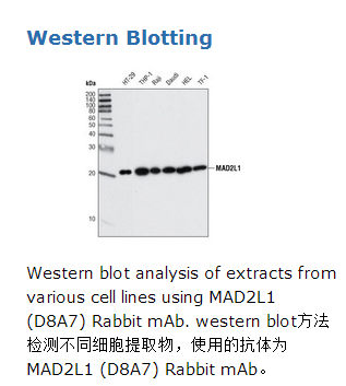 MAD2L1 (D8A7) Rabbit mAb 能够检测内源性 MAD2L1总蛋白。该单克隆抗体是由合成的人源的针对MAD2L1蛋白氨基末端的肽段免疫动物生产的。先于细胞分裂发生的姐妹染色单体正确分离在维持基因组完整性和避免非整倍体性和染色体不稳定性(许多肿瘤细胞的特征)的过程中至关重要。有丝分裂检验点,又称纺锤体装配检验点,监测着丝粒准确附着到纺锤体上面,抑制有丝分裂并延迟分裂后期的到来直至染色体分配到赤道板(1)。MAD2L1是有丝分裂检验点必不可少的参与者(2)。它以两种构象存在,包括打开的非激活O-MAD2形式和关闭的激活C-MAD2形式。在有丝分裂之前,MAD2L1定位于细胞质且主要以C-MAD2形式存在。在有丝分裂检验点,MAD2L1开启O-MAD2构象形式(3)。同其它的检验点蛋白一起,MAD2L1结合并抑制Cdc20,从而抑制分裂后期促进复合体(4)。当着丝粒准确附着到纺锤体以后,MAD2L1释放Cdc20,允许分裂后期促进复合体的激活,随后降降核心的有丝分裂底物,启动分裂中期-分裂后期转换(5)。