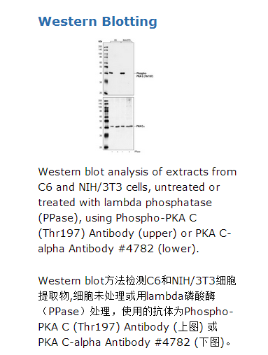 磷酸-PKA C(Thr197)抗体检测内源性的苏氨酸(197位)磷酸化的PKA C(-α-β-γ)蛋白。此抗体不与PKAÇ在其他磷酸化位点发生交叉反应。该多克隆抗体通过用合成磷酸肽免疫动物制备,该合成肽对应人PKA C苏氨酸(197位)附近的残基。抗体由protein A和肽亲和层析法纯化。在哺乳动物细胞中,第二信使环磷酸腺苷(cAMP)激活cAMP依赖性蛋白激酶(PKA或CAPK),并控制许多细胞机制,如基因转录,离子转运和蛋白磷酸化(1)。不活跃的PKA是异源四聚体,由一个二聚体调节亚基(R)和一个二聚体催化亚基(C)组成。当处于非活跃状态时,R亚基的假底物序列阻断C亚基上的活性位点。已经确定,有三种C亚基亚型(C-α,C-β,和C-γ)和两个调节亚基(RI,RII)家族,具有独特的与cAMP结合性能。两个R家族中存在的两种异构体,α和β(RI-α, RI-β,RII-α,RII-β)。cAMP与R亚基结合后,缓解自抑制接触作用,释放活跃的单体C亚基。PKA与Akt(PKB)和蛋白激酶C有底物特异性,其特点是-3位点的精氨酸与磷酸化丝氨酸或苏氨酸残基有关(2)。已经证明,具有这些共有序列的底物,会被PKA激酶磷酸化Bad (Ser155)、 CREB (Ser133)和 GSK-3 (GSK-3α Ser21和GSK-3β (Ser9)(3-5)等位点。此外,将PKAC-α和β同时下调,阻断了cAMP介导的Raf(Ser43和Ser259)的磷酸化(6)。自身磷酸化和通过PDK-1的磷酸化是两种已知的导致C亚基Thr197位点磷酸化的机制(7)。